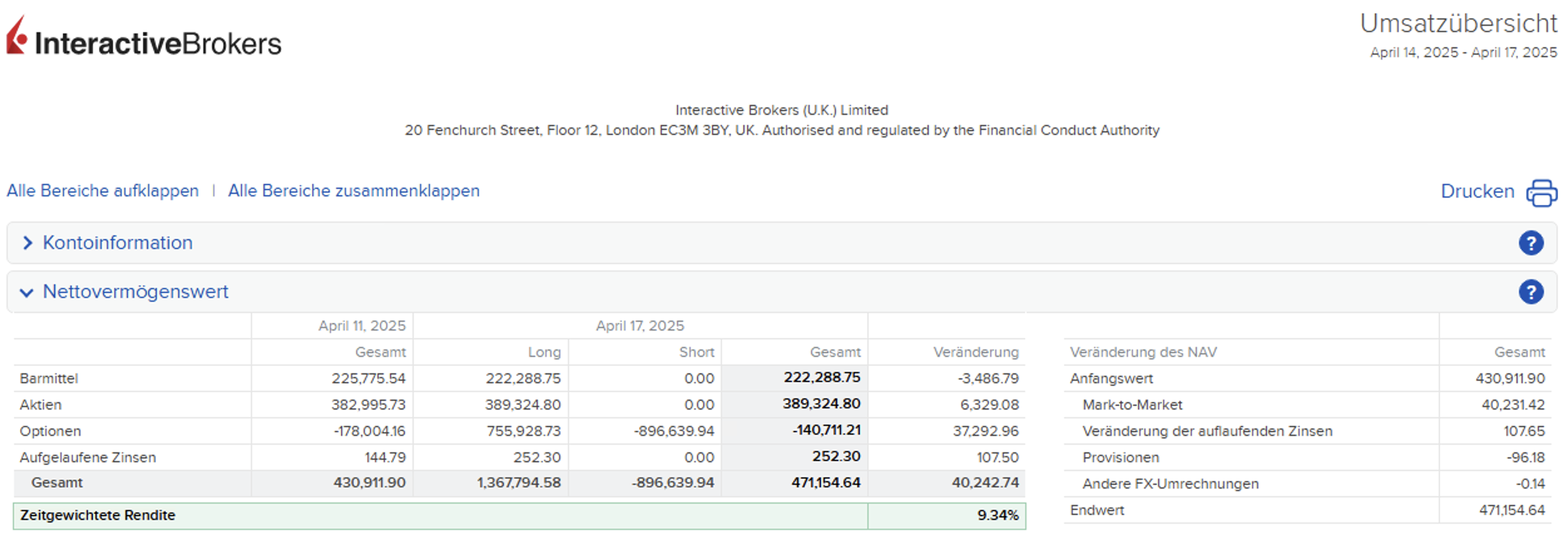 Ende nächster Woche werde ich mich entscheiden müssen, wie ich mit den Positionen weiter umgehe. Die reguläre Laufzeit in den grossen Iron Condors geht noch bis zum 16. Mai. Sollten sich die Märkte bis dahin in einer Range zwischen 5160 und 5635 im SPX und in den QQQs zwischen 415 und 490 bewegen, hätten meine Positionen noch enormes Potential für weitere Gewinne. Kommenden Freitag wird aber die „21-Tage-Grenze“ erreicht. Positionen dann zu schliessen oder zu rollen kann Vola aus dem Depot raus nehmen. Ich bin noch unentschieden.