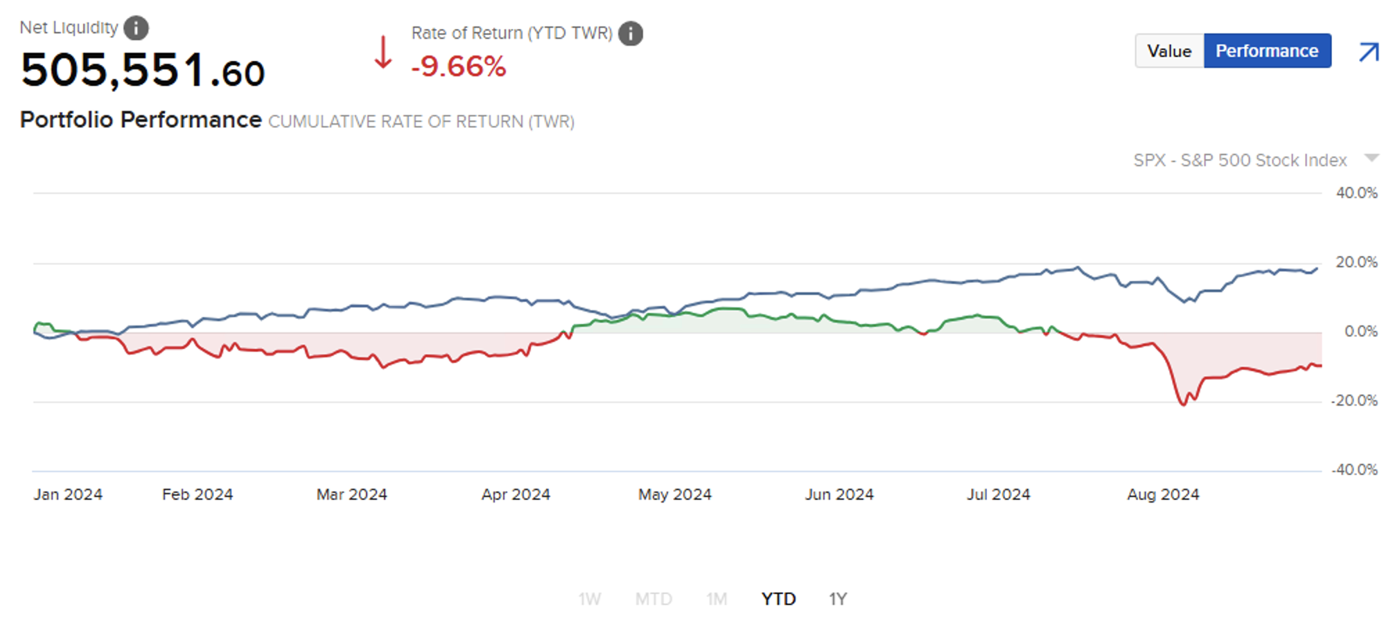 4quadrat (diskretionär): mit SMCI hat uns diese Woche ein heftiger Abverkauf erwischt. Zunächst gab es eine Shortseller-Attacke von Hindenburg Research. Am Tag drauf musste SMCI dann sogar eingestehen, dass sie obligatorische Finanzberichte nicht rechtzeitig liefern können. Für eine Firma dieser Grössenordnung ein absolutes No-Go. Dennoch entschied ich eine spekulative Reparatur zu öffnen. Realisiert wurden aber zunächst -2.436,33 USD Verlust. Auf zusätzliche neue Trades verzichtete ich diese Woche, weil mit jeweils 4 und 5 Trades (kleine und grössere) die Depots bereits relativ voll sein dürften und wir ausserdem einige Reparaturen am Laufen haben.